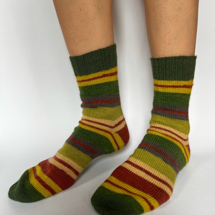 Rankų darbo „Grasshopper“ kojinės spindi žaliomis natomis ir patogumu – įkvepia energijos ir tampa išskirtiniu tavo stiliaus akcentu.